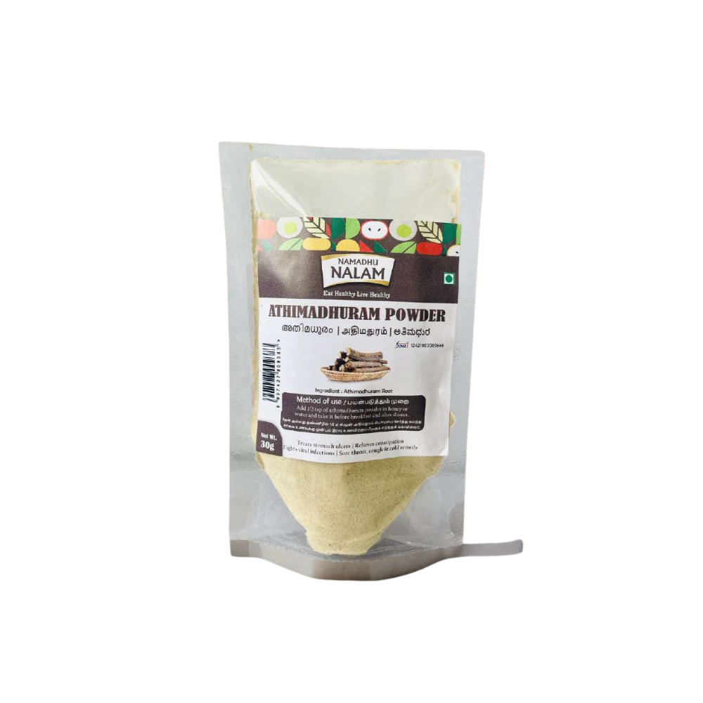Athimathuram Podi is a traditional South Indian spice blend made from dried Athimathuram (licorice root) along with roasted spices like cumin, coriander, and black pepper. Known for its sweet, slightly bitter flavor, it is used to aid digestion, soothe sore throats, and promote overall respiratory health. Athimathuram Podi is often mixed with rice or used as a seasoning in curries and dals, providing a unique, aromatic taste while offering several health benefits, including boosting immunity and improving digestive function.