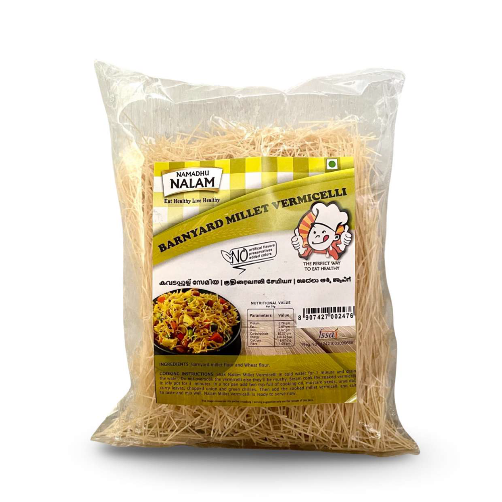 Barnyard Vermicelli is a healthy, gluten-free noodle made from Barnyard Millet, a grain known for its high fiber, protein, and essential minerals. This vermicelli offers a nutritious, low-glycemic alternative to traditional noodles, making it ideal for managing blood sugar levels and promoting digestive health. Barnyard Vermicelli is light, easy to digest, and provides sustained energy. It can be used in a variety of dishes such as upma, stir-fries, or soups, offering a wholesome, flavorful option that supports overall well-being.