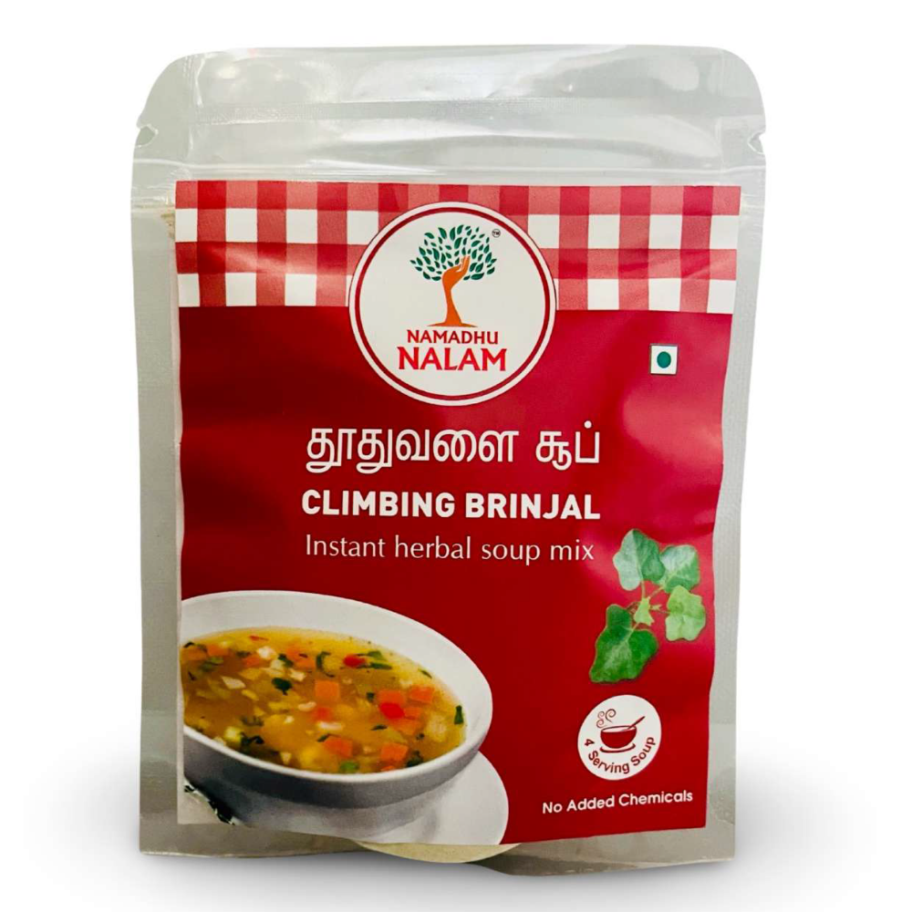 Climbing Brinjal Soup Mix is a nutritious and flavorful soup blend made from Climbing Brinjal (Solanum trilobatum), a variety of brinjal (eggplant) known for its medicinal properties. This soup mix combines the goodness of Climbing Brinjal with a selection of traditional spices, offering a soothing and healthy broth. Climbing Brinjal is known for its ability to support respiratory health, improve digestion, and boost immunity. This soup is a great choice for detoxification, promoting overall wellness, and enhancing skin health. A perfect addition to any diet, Climbing Brinjal Soup Mix provides both nourishment and healing in a delicious, comforting form.