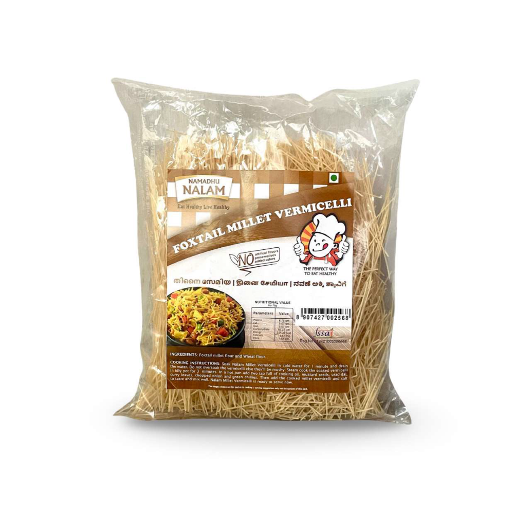 Foxtail Vermicelli is a healthy, gluten-free alternative made from Foxtail Millet, a nutrient-rich grain packed with fiber, protein, and essential minerals. Known for its low glycemic index, Foxtail Vermicelli helps in managing blood sugar levels while providing sustained energy. It supports digestive health and promotes overall wellness. This versatile vermicelli can be used in various dishes like upma, stir-fries, or soups, offering a delicious and wholesome option for those seeking a nutritious, gluten-free meal. ItÕs an ideal choice for a light, easy-to-digest meal.