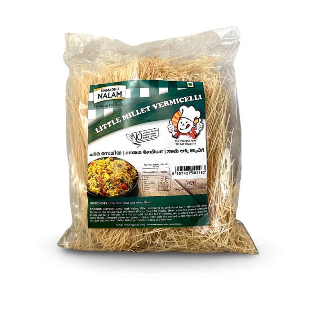 Little Millet Vermicelli is a nutritious, gluten-free alternative to traditional vermicelli, made from Little Millet, a grain known for its high fiber, protein, and essential minerals. This vermicelli is light, easy to digest, and perfect for those looking to enjoy a healthy meal with a low glycemic index, helping to manage blood sugar levels. Little Millet Vermicelli can be used in a variety of dishes such as upma, pulao, or soups, offering a delicious, wholesome, and energy-boosting option for your meals. ItÕs a great choice for those seeking a healthy, gluten-free addition to their diet.