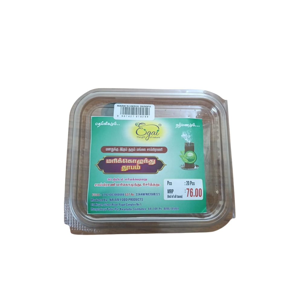 Marikolundhu Dhoops are traditional incense sticks made from the aromatic Marikolundhu (also known as Indian Laburnum), a natural herb revered for its soothing and purifying properties. These dhoops release a calming, earthy fragrance that creates a peaceful atmosphere, perfect for use during spiritual rituals, meditation, or relaxation. The natural ingredients ensure a pure, chemical-free aroma, ideal for cleansing the air and promoting mental clarity and calmness. Marikolundhu Dhoops are perfect for enhancing your home or temple with a serene, aromatic ambiance, offering a natural, holistic alternative to synthetic incense.