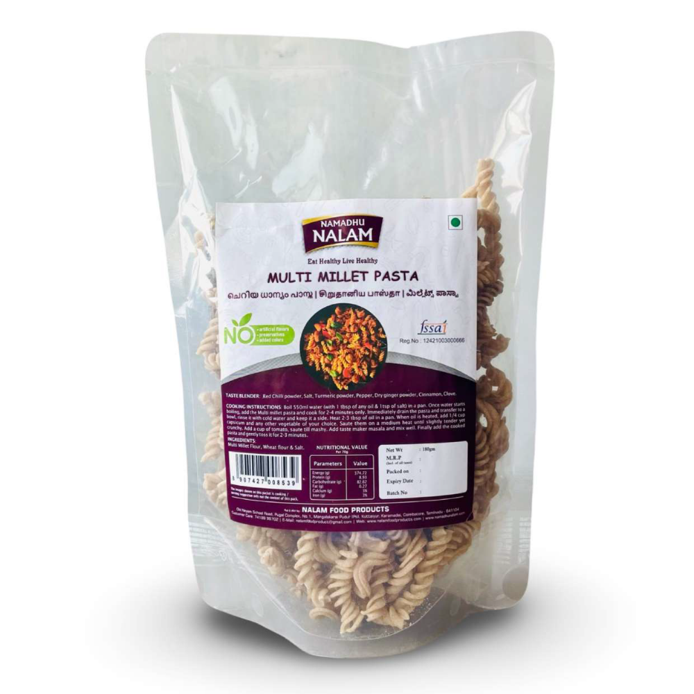 Multi Millet Pasta is a wholesome, gluten-free alternative made from a blend of various millets such as Foxtail, Little Millet, Pearl Millet, and Barnyard Millet. This nutrient-packed pasta is rich in fiber, protein, and essential minerals, providing a healthy and delicious option for those seeking to incorporate more whole grains into their diet. With a low glycemic index, Multi Millet Pasta helps regulate blood sugar levels and promotes digestive health. It is versatile and can be used in a variety of dishes like pasta salads, stir-fries, or traditional pasta recipes, making it a nutritious and flavorful addition to any meal.