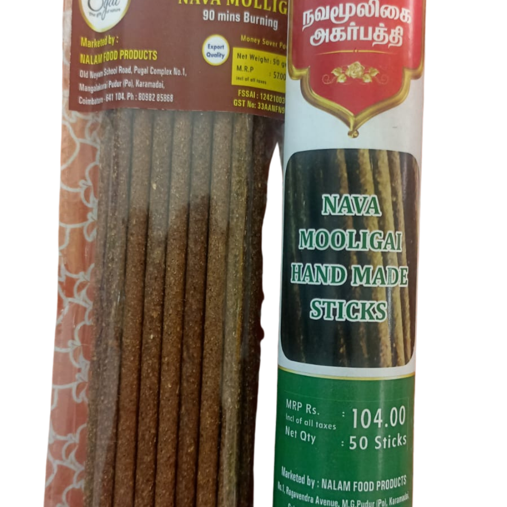 Nava Mooligai Agarbathi Pouch contains incense sticks made from a blend of nine powerful medicinal herbs (Nava Mooligai) known for their spiritual and healing properties. These herbs, carefully selected for their purity and potency, create a fragrant aroma that purifies the air, promotes mental clarity, and provides a calming effect. The Nava Mooligai Agarbathi Pouch is ideal for use during meditation, prayers, or relaxation, helping to create a peaceful, balanced environment. Its natural, earthy fragrance also aids in clearing negative energies, making it perfect for enhancing your home, temple, or sacred space.