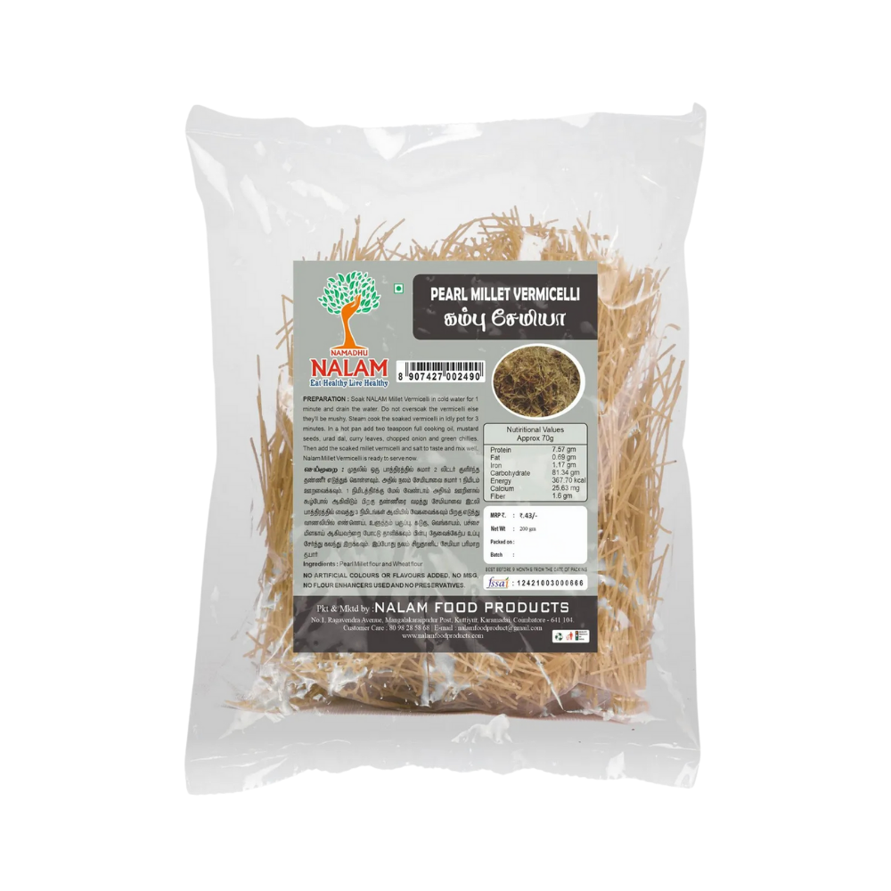 Pearl Millet Vermicelli is a nutritious, gluten-free alternative made from Pearl Millet (Bajra), a grain rich in fiber, protein, and essential minerals like iron and magnesium. This vermicelli is easy to digest and offers a healthy, energy-boosting meal option with a low glycemic index, making it ideal for managing blood sugar levels. Pearl Millet Vermicelli can be used in a variety of dishes such as upma, stir-fries, or soups, offering a wholesome, delicious alternative to traditional vermicelli. ItÕs perfect for those seeking a gluten-free, nutrient-packed option in their meals.