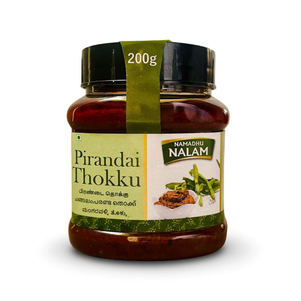 Pirandai Thokku Pet is a unique and flavorful condiment a medicinal plant known for its healing properties. The plant is cooked with a blend of spices and tamarind to create a tangy, spicy thokku that pairs wonderfully with rice, rotis, or parathas. Pirandai Thokku is celebrated for its ability to aid digestion, reduce inflammation, and improve joint health. This tasty thokku not only adds a burst of flavor to your meals but also brings the health benefits of Pirandai in a delicious, easy-to-enjoy form.