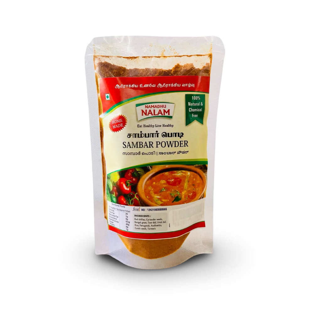 Sambar Podi is a traditional South Indian spice blend used to make sambar, a flavorful lentil-based stew. It typically contains a mix of roasted spices like coriander, cumin, mustard seeds, fenugreek, and red chilies, giving it a rich, aromatic flavor with a perfect balance of heat and earthiness. Sambar Podi adds depth and complexity to dishes, enhancing their taste with its unique, bold flavor. It is an essential ingredient in South Indian cuisine, commonly paired with rice or vegetables for a delicious and nutritious meal.