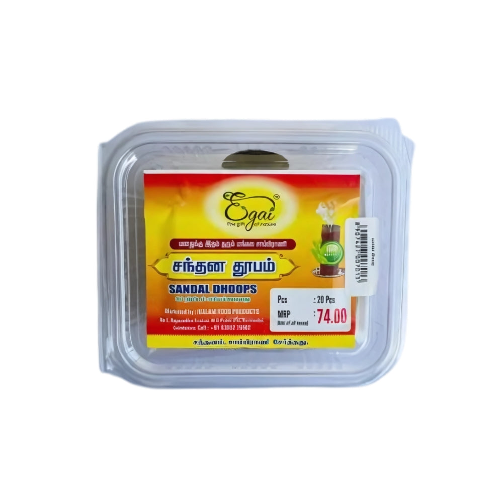 Sandal Dhoops are aromatic incense sticks made from natural sandalwood, known for their calming and soothing fragrance. The dhoops are used in various rituals, meditation, and spiritual practices to create a peaceful and serene atmosphere. Sandalwood has been revered for centuries for its therapeutic properties, including stress relief and mental clarity. Sandal Dhoops release a rich, warm scent that purifies the air and promotes relaxation, making them perfect for use during prayer, yoga, or simply to enhance the ambiance of your home. These dhoops are crafted with natural ingredients, ensuring a clean and aromatic experience.