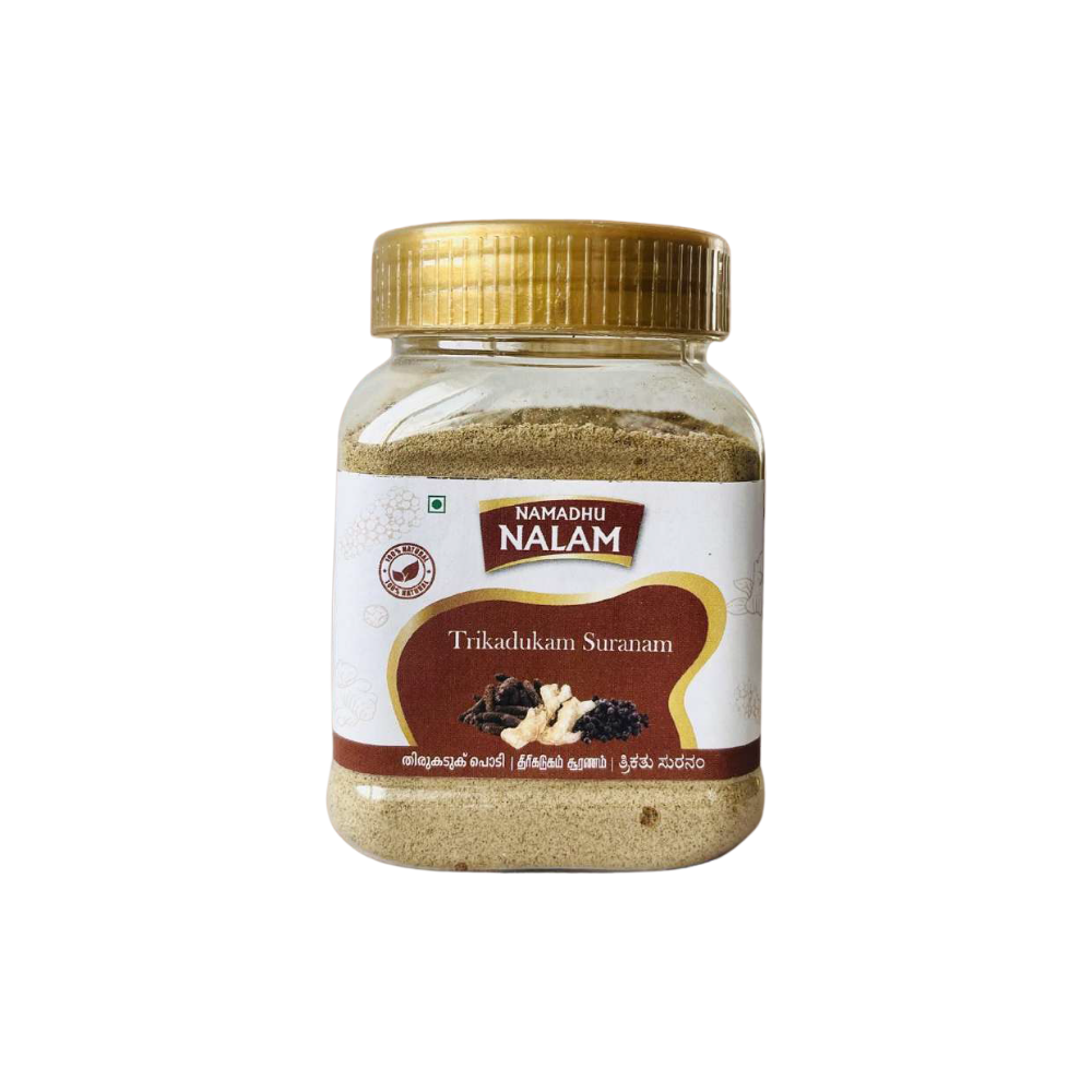 Thirikadugam Podi is a traditional South Indian spice blend made from a combination of medicinal herbs and spices, including dried ginger, black pepper, cumin, and fenugreek. This podi is known for its powerful digestive properties and is often used to relieve indigestion, bloating, and stomach discomfort. With its warm, aromatic, and slightly spicy flavor, Thirikadugam Podi is typically mixed with rice or ghee, or served alongside curries and stews. It is a popular remedy in Ayurvedic practices, valued for its ability to enhance digestion and promote overall wellness.